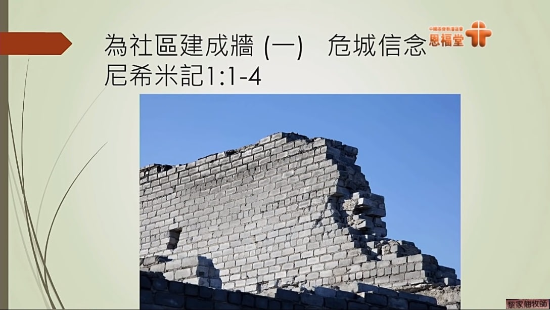 危城信念 講員 : 黎家翹牧師 證道經文:尼希米記1:1-4【和合本修訂版】 引言: 危城歲月三十年 危城信念: 一. 擴闊一步 二. 連於內心 三. 勝過無力 總結:神必記念與神的記念 日期 : 2019-06-16