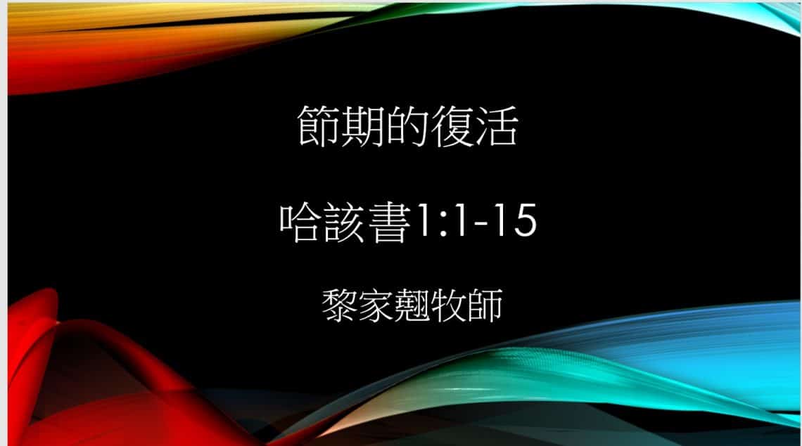 節期的復活 講員 : 黎家翹牧師 證道經文:哈該書1:1-15【和合本修訂版】 (一) 引言: 復活節的危機 哈該的名字 一. 節期的死亡,神子民懼怕 — 波斯王朝的文化 — 波斯王朝的勢力 — 波斯王朝的君王 二. 節期的重生 — 神的診斷 — 現實的省察 — 敬畏與行動 應用: — 敬畏 — 上山取木 日期 : 2019-04-21